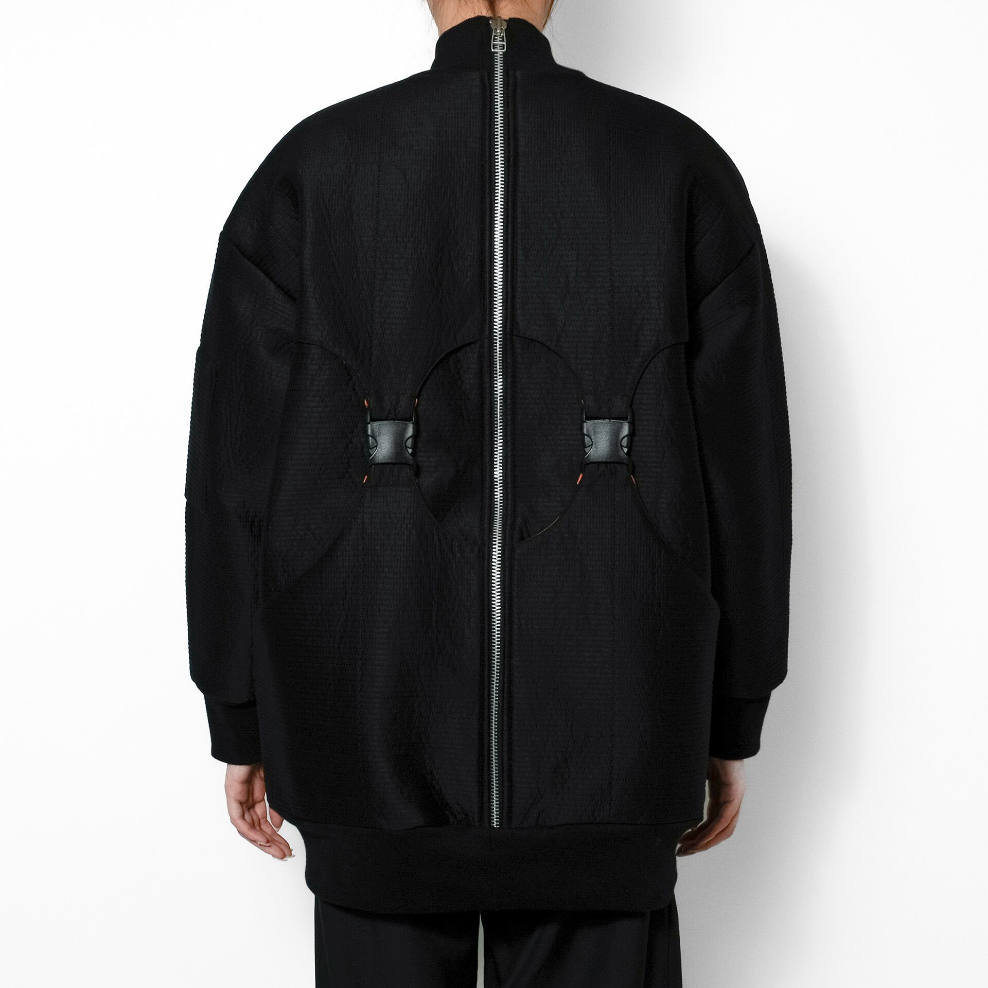 前後にファスナーを備えた仕様で、スタイルに応じて前後の印象を自在に変えられるのもポイントです。