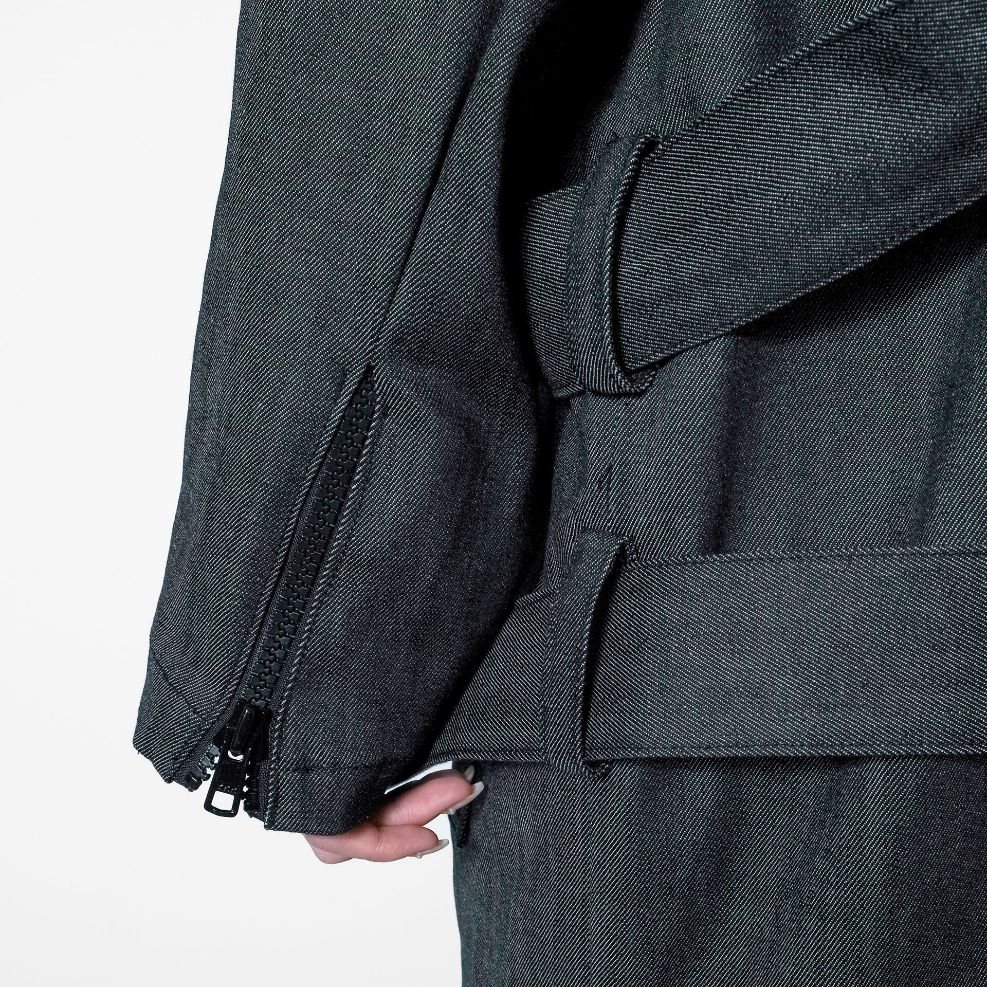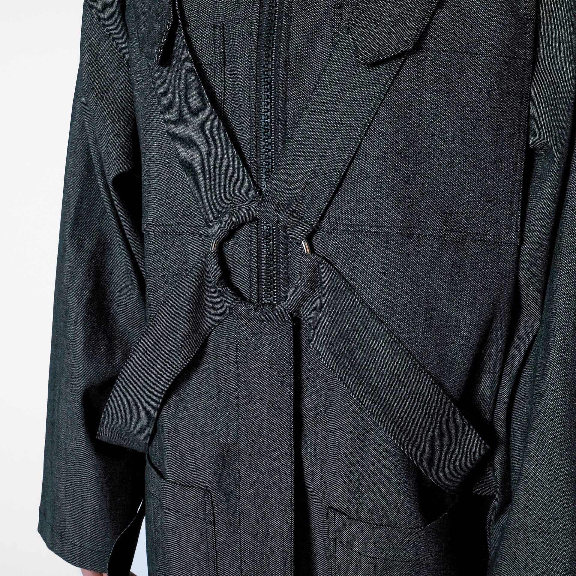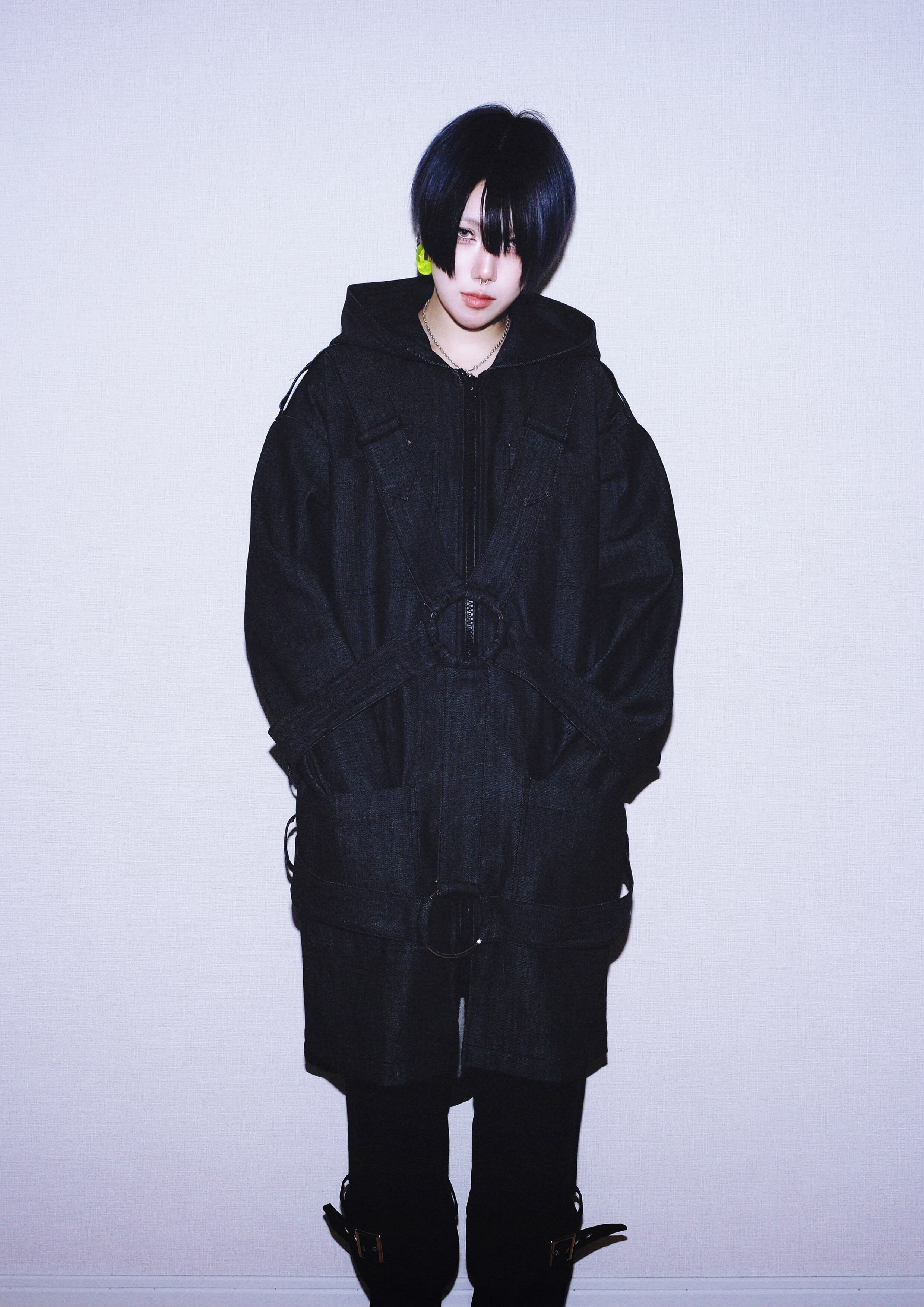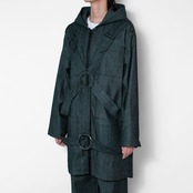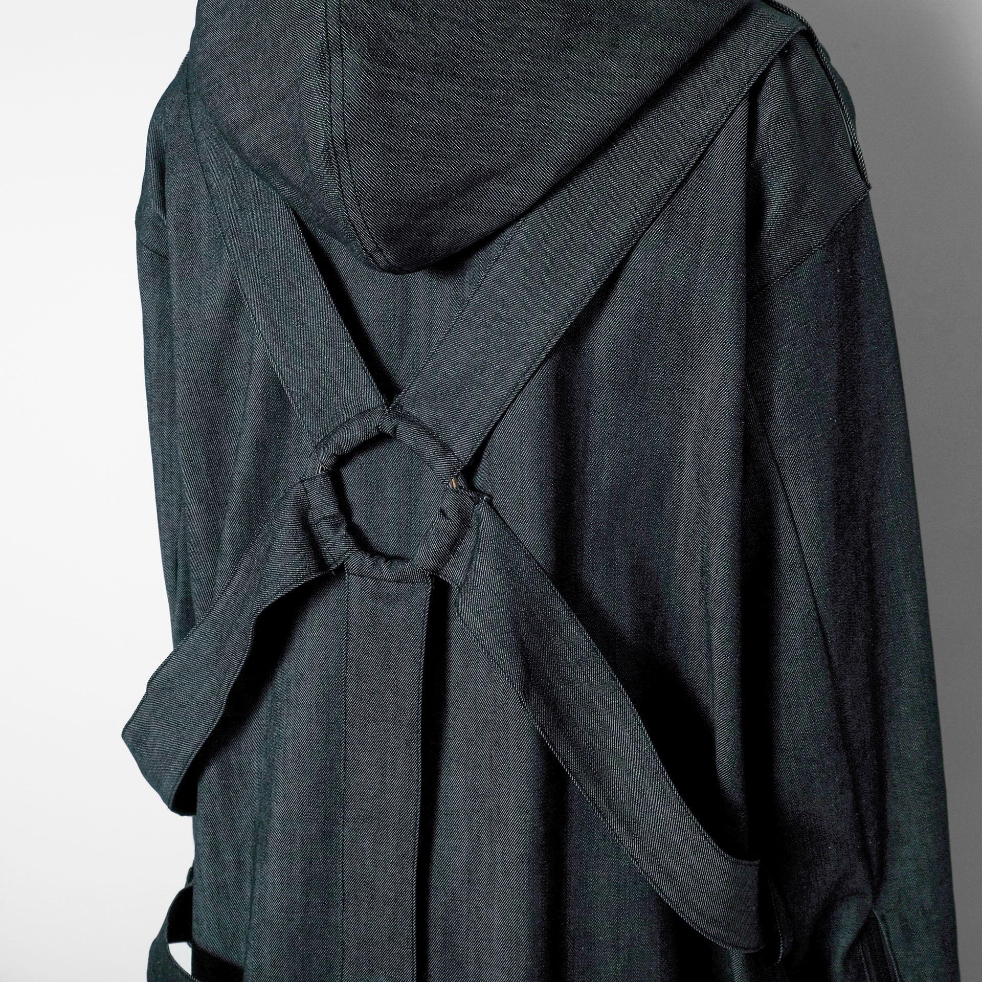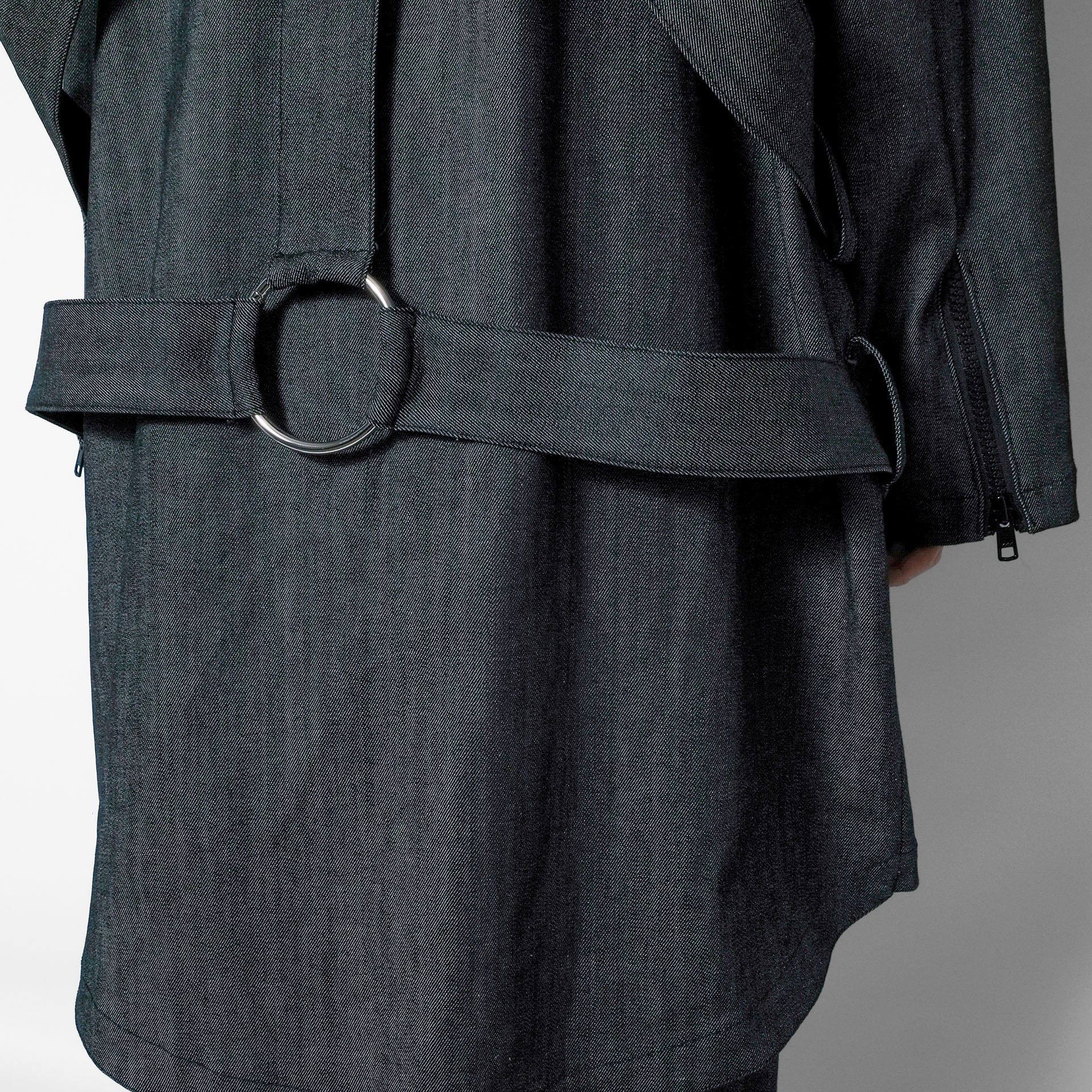 ラフで無骨な印象を与えるデニム素材を使用した、モッズコート。