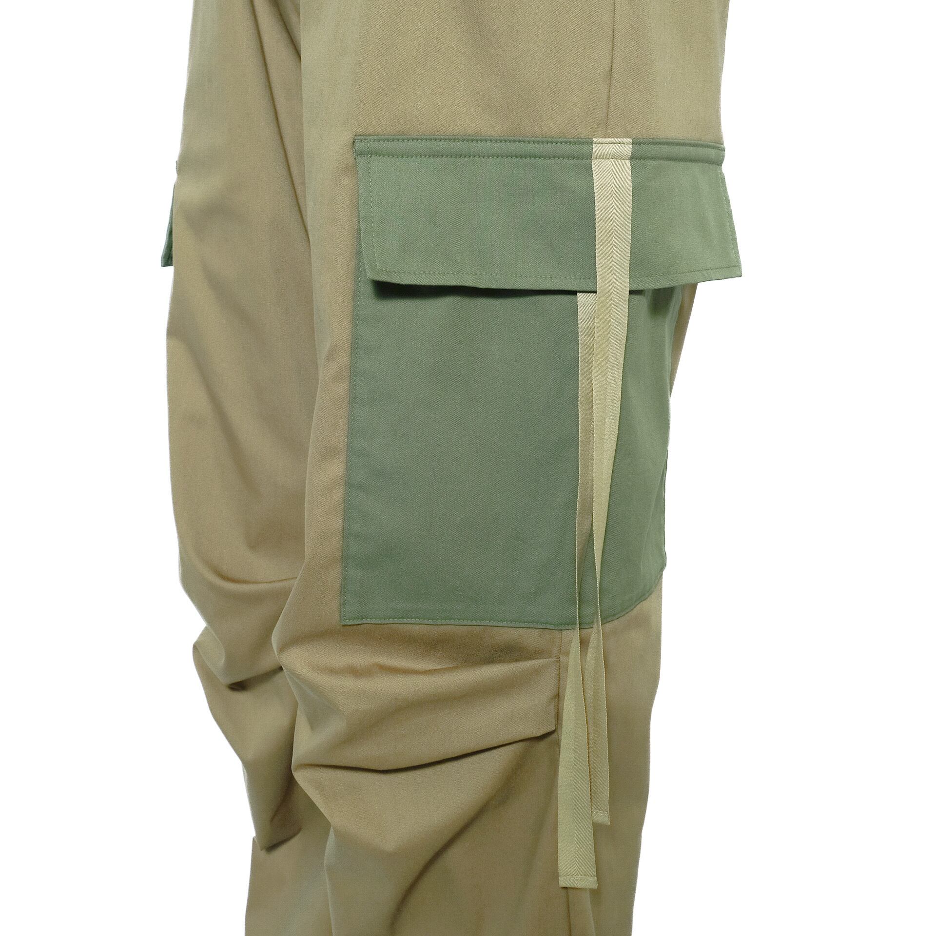 綿ナイロンのストレッチラチネを使用したバイカラーデザインのカーゴパンツです。