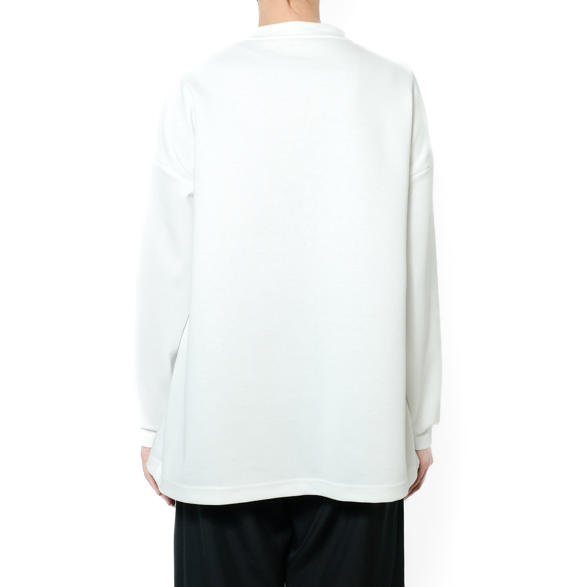 プレミアコットンダンボールニットの素材感が心地よく、着る人を選ばないデザインで、様々なスタイルに合わせやすい一品です。