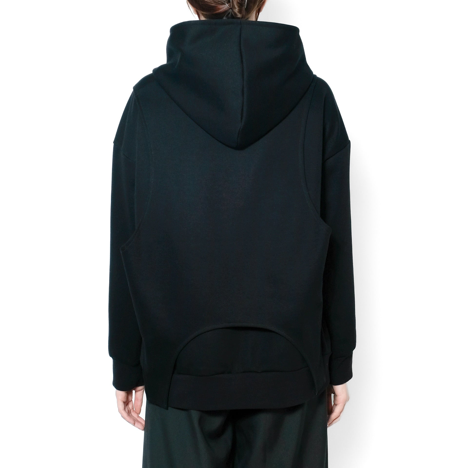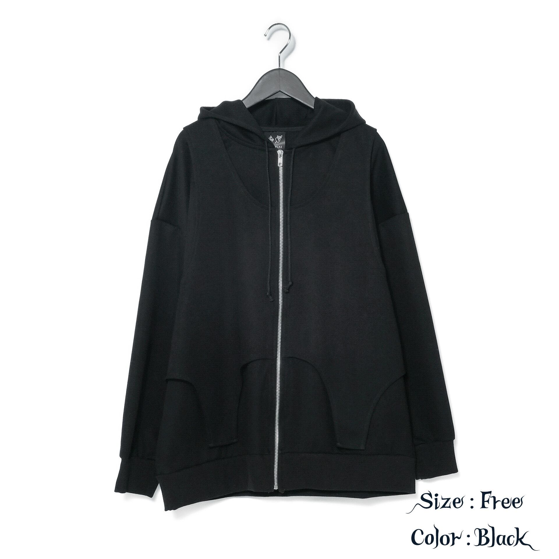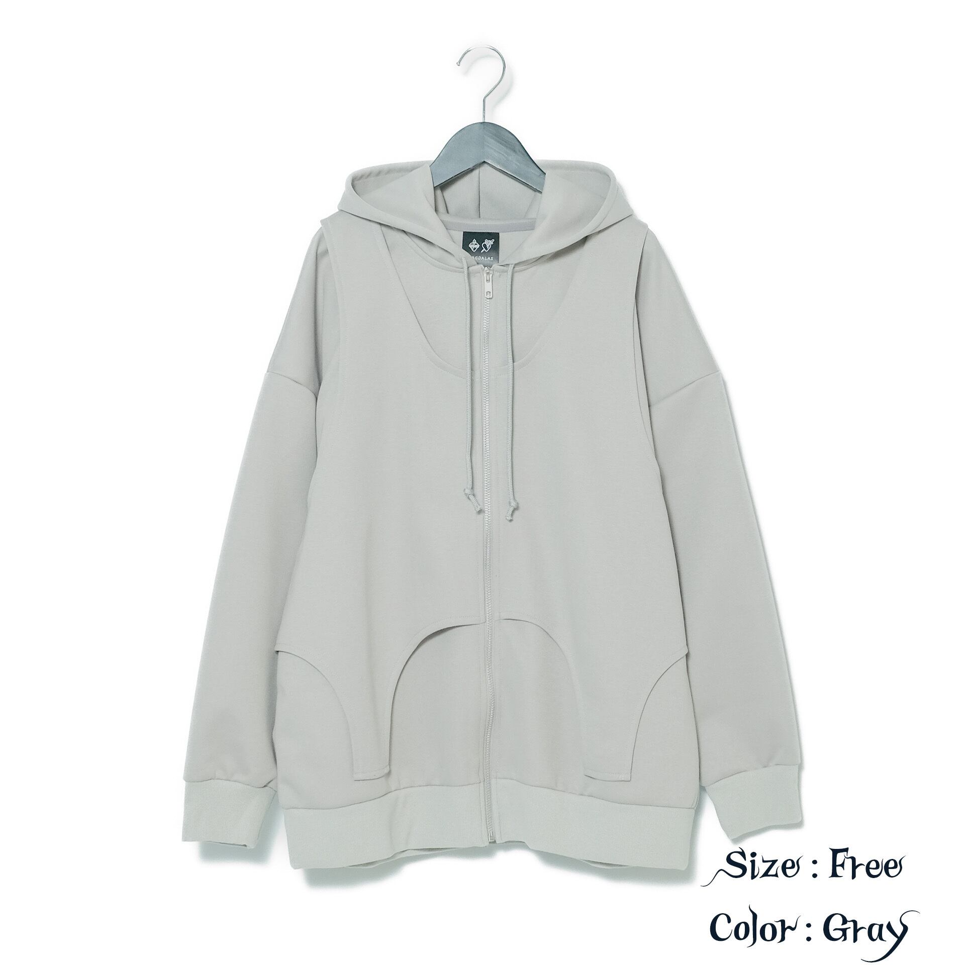 このパーカーは、重ね着風のスタイルを一枚で楽しめる画期的なデザインが魅力です。ファスナー付きなので、気温に応じて調整しやすく、カジュアルなのでどんなボトムスとも合わせやすい一品です。